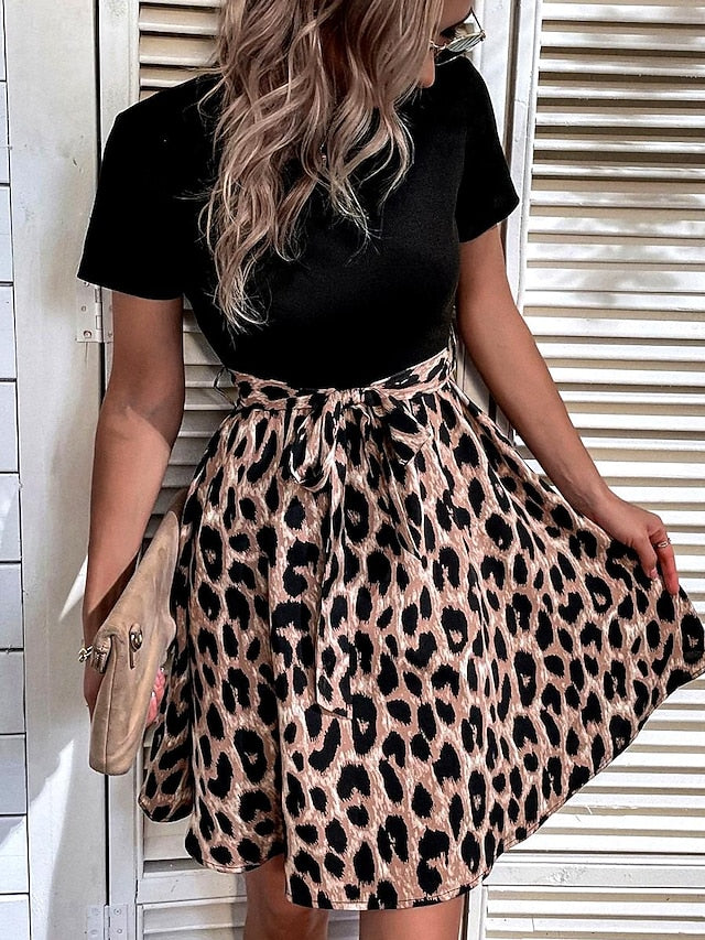 Women's Leopard Tie Front Crew Neck Mini Dress Stylish