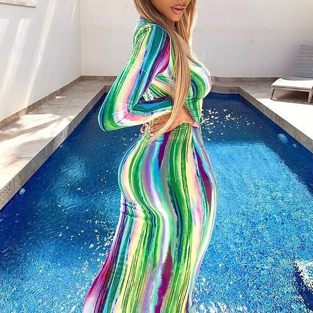 Dresses Type: Boho Dress, Casual Dress, Fabric: Cotton, Gender: Women's, Design: Print, Occasion: Date, Holiday, Outdoor, Style: Fashion, Modern, Fit Type: Regular Fit, Dress Length Type: Long Dress Maxi Dress, Neckline: Deep V, Sleeve Length: Long Sleeve, Elasticity: Micro-elastic, Look After Me: Machine wash, Pattern: Striped, Season: Spring, Summer,