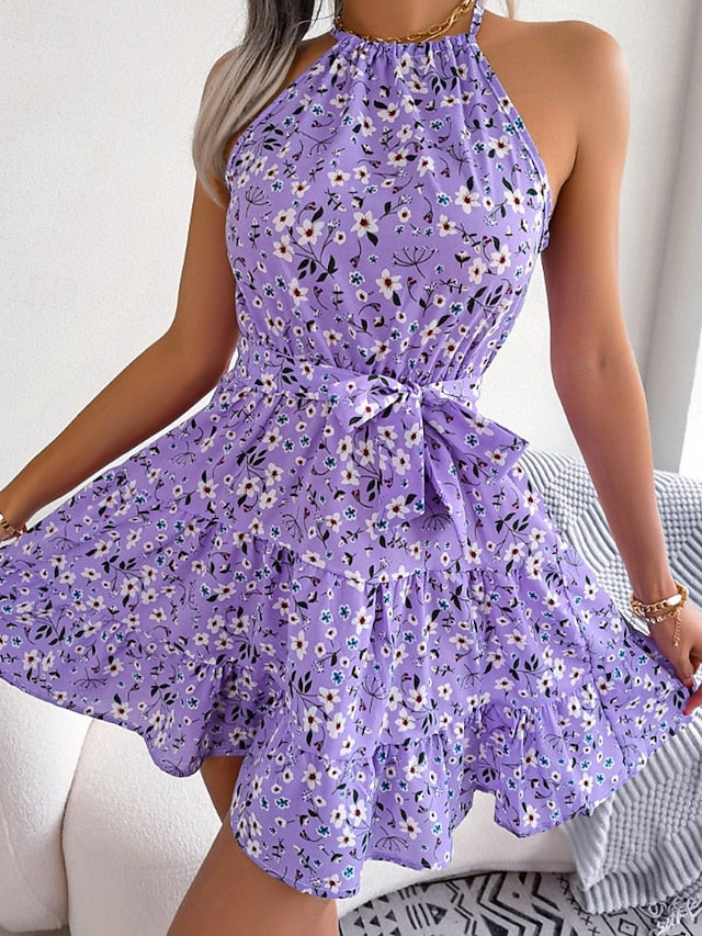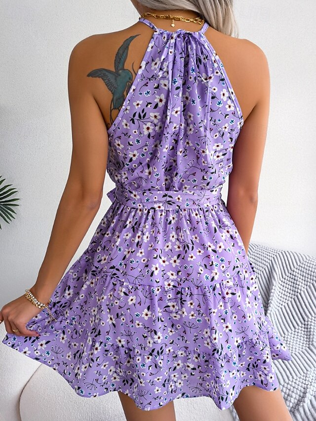 Dresses Type: Print Dress, Casual Dress, Floral Dress, Fabric: Polyester, Gender: Women's, Design: Print, Ruched, Occasion: Daily, Going out, Beach, Weekend, Style: Modern, Fit Type: Regular Fit, Dress Length Type: Mini Dress, Neckline: Halter Neck, Sleeve Length: Sleeveless, Elasticity: Inelastic, Look After Me: Hand wash, Machine wash, Pattern: Floral, Season: Summer, Spring,