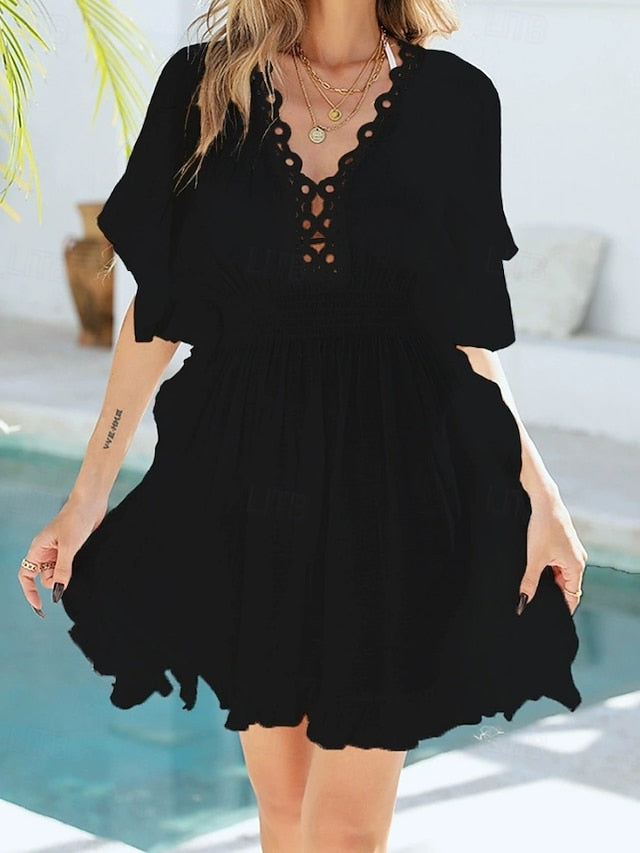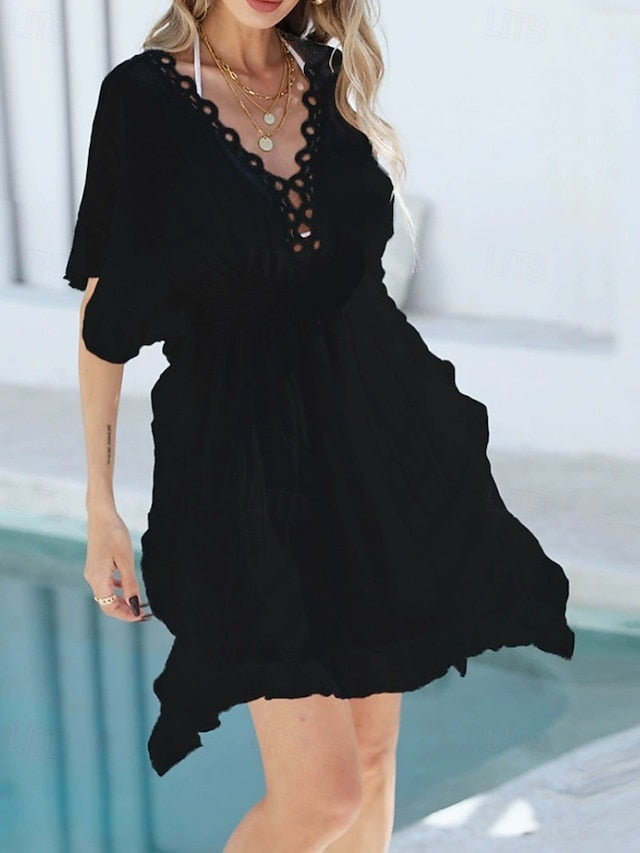 Swimwear Category: Cover Up, Swim Dress, Design: Cut Out, Pattern: Solid Color, Fabric: Polyester, Style: Beach Wear, Vacation, Summer, Occasion: Vacation, Beach, Neckline: V Neck, Elasticity: Inelastic, Function: Sports, Outdoor, Swimming, Comfy, Sleeve Length: Short Sleeves, Bottom Type: Dress,