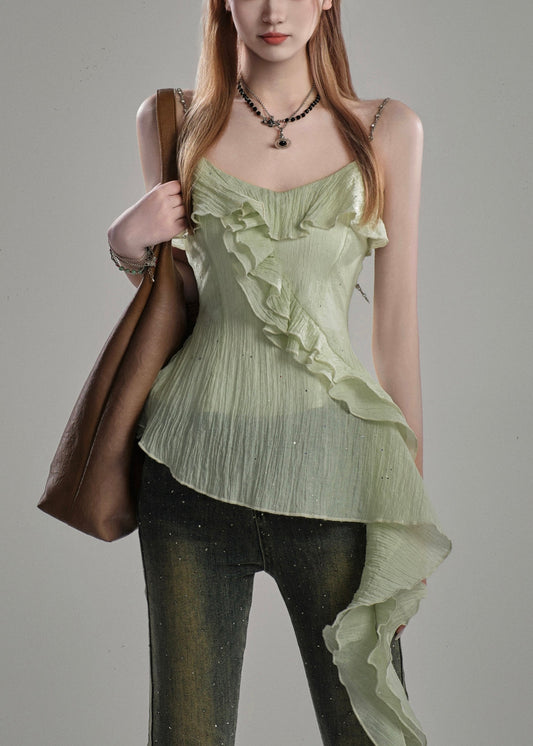 Französisches gelbes asymmetrisches gerüschtes Baumwoll-Spaghettiträger-Tanktop ärmellos KK073
