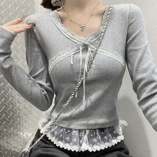 Long-Sleeve V-Neck Plain Lace Trim Tie Front Slim Fit Crop T-Shirt