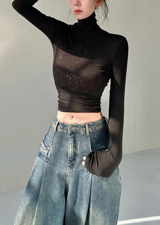 French White Hign Neck Zircon Cotton T Shirts Top Fall