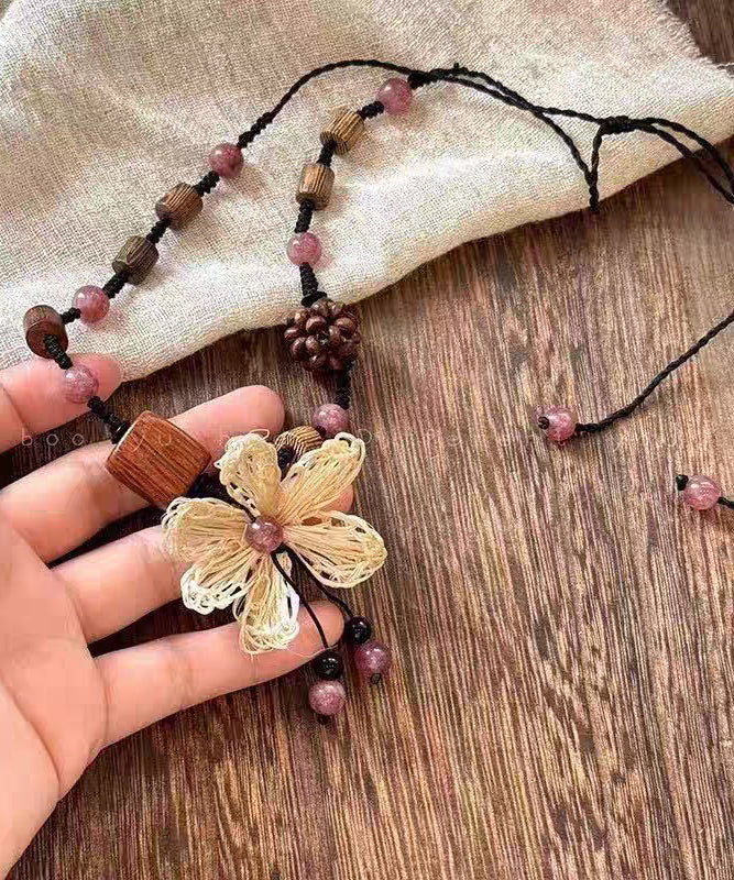Handmade Black Braided Rope Floral Coloured Glaze Wood Gratuated Bead Necklace