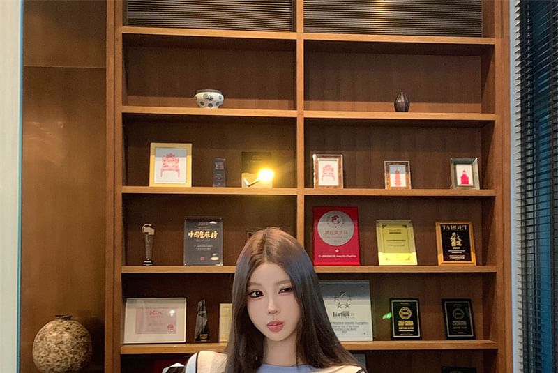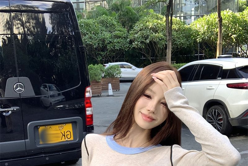 Long-Sleeve Crew Neck Contrast Trim Slim Fit Knit Top