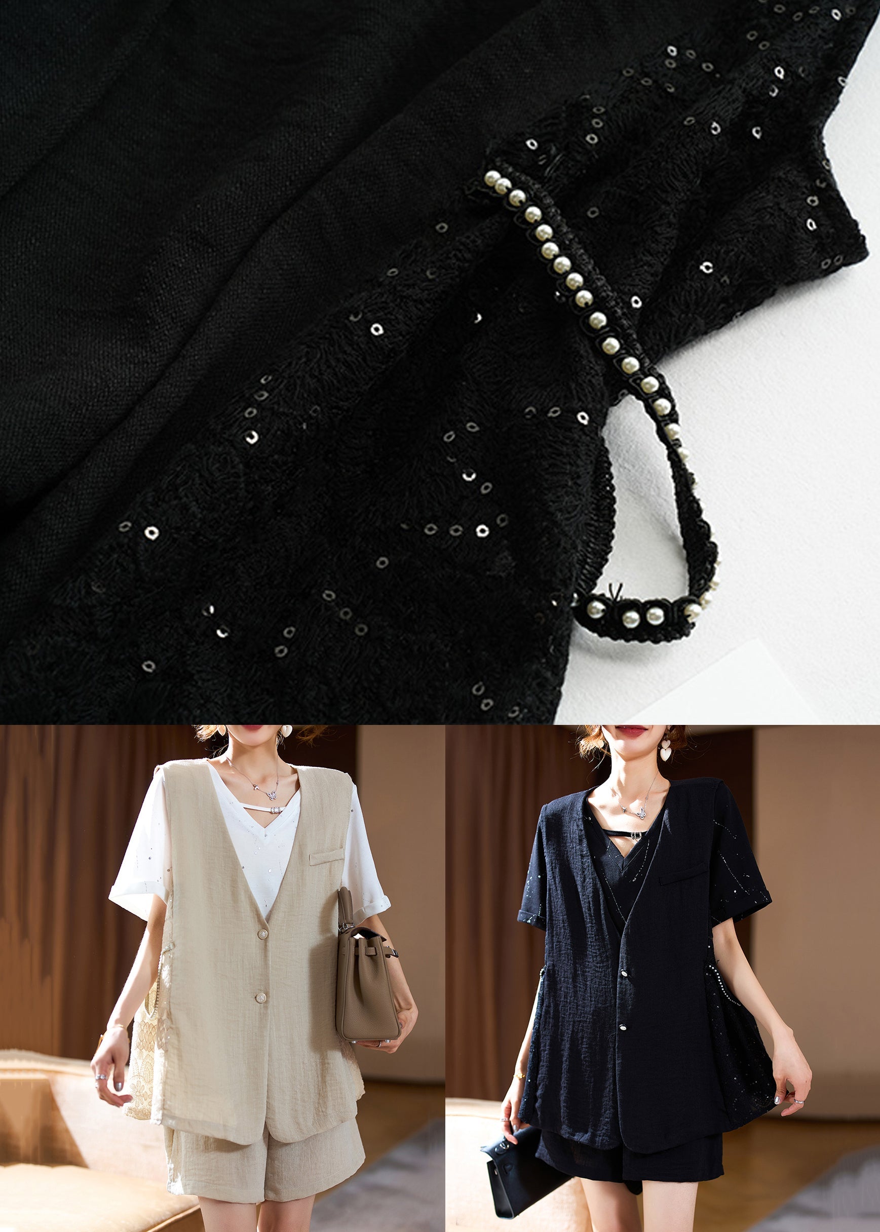 Loose Khaki V Neck Button Cotton Two Pieces Set Summer AC1004