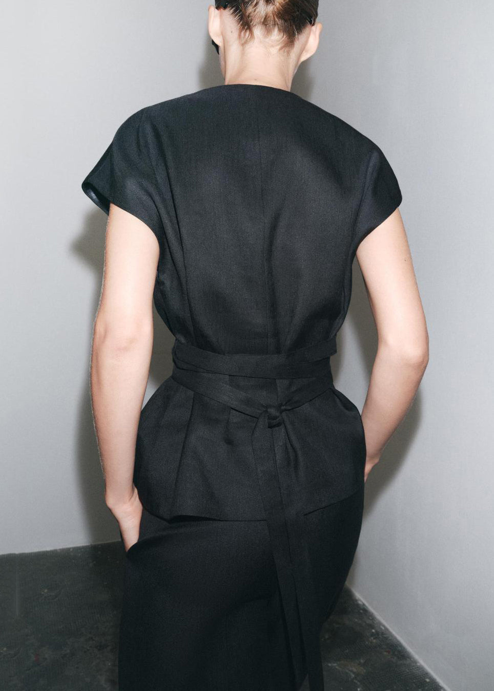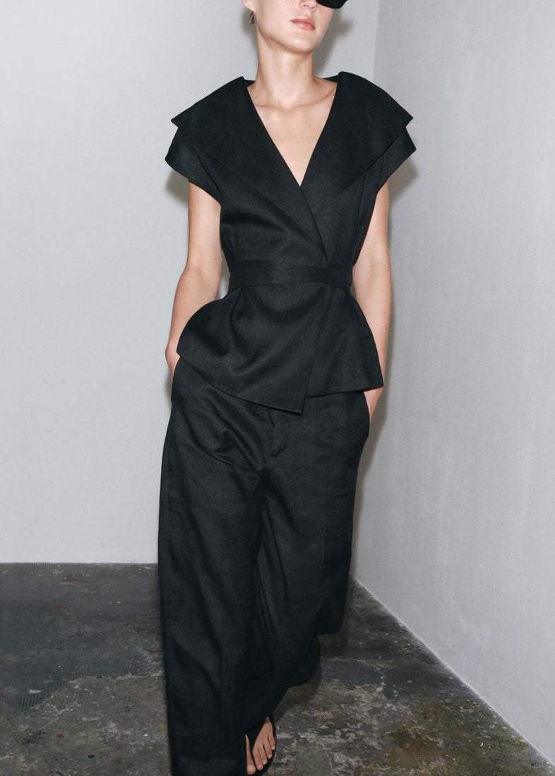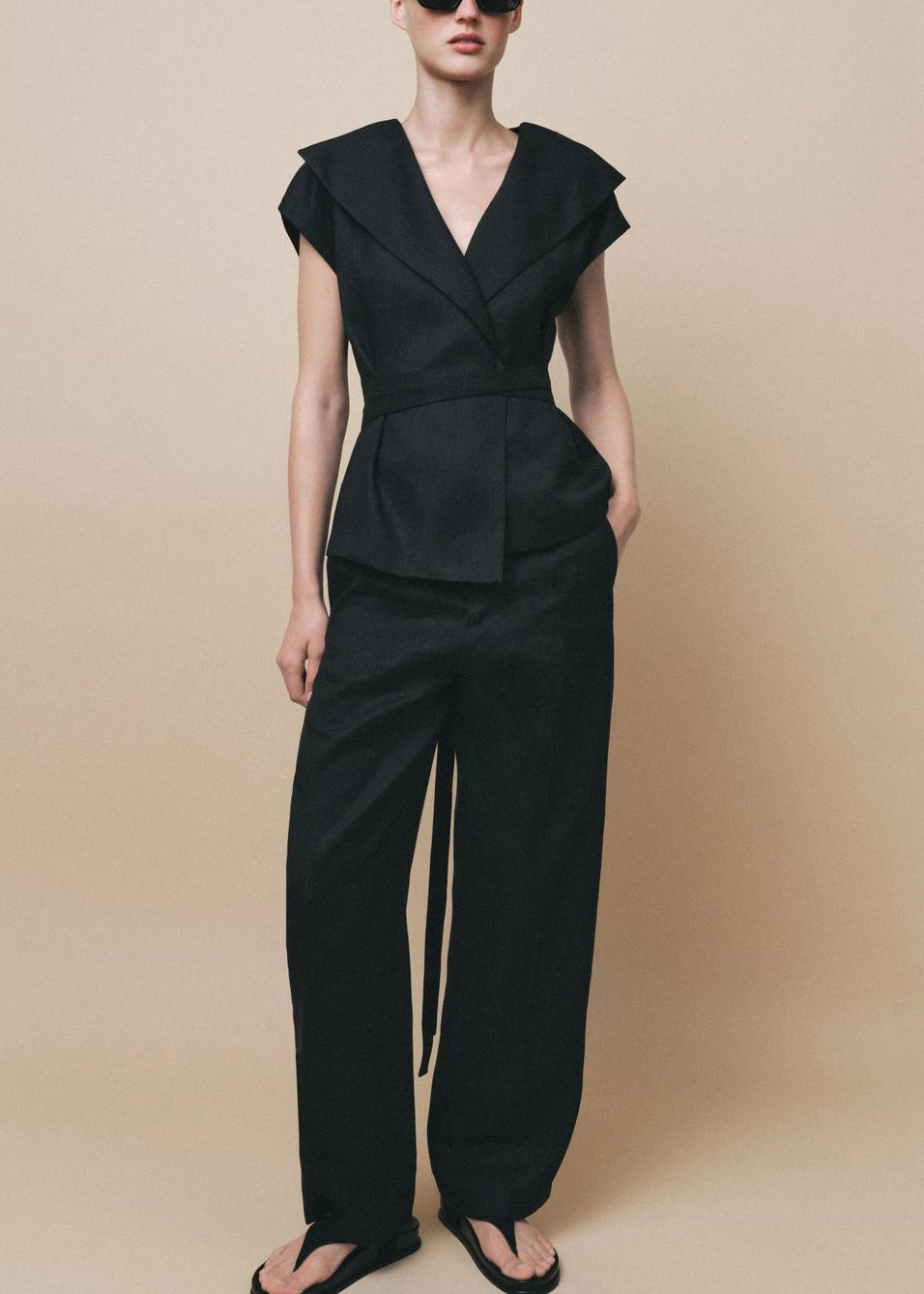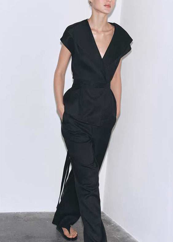 Slim Fit Black V Neck Tie Waist Cotton Two Pieces Set Summer