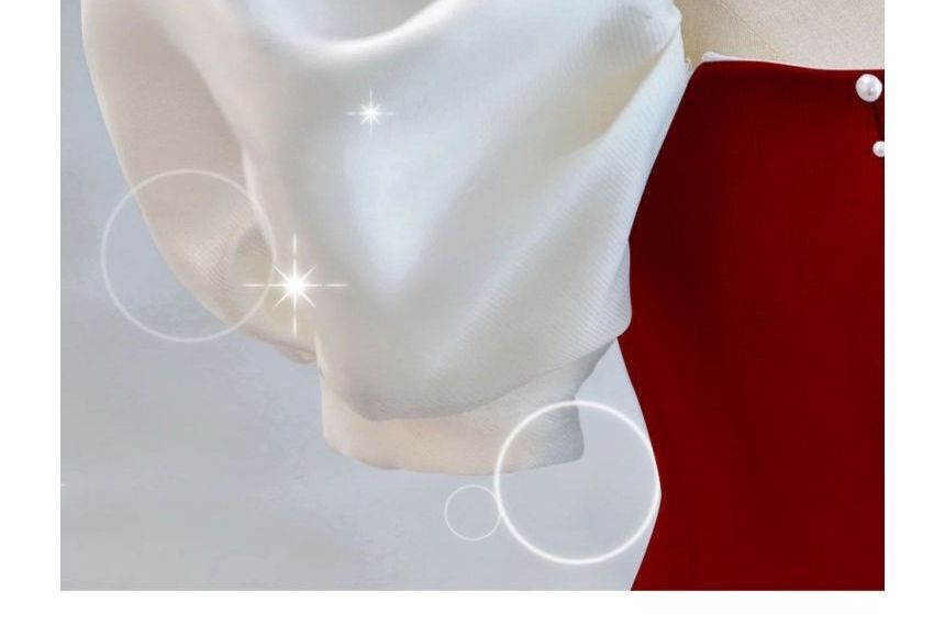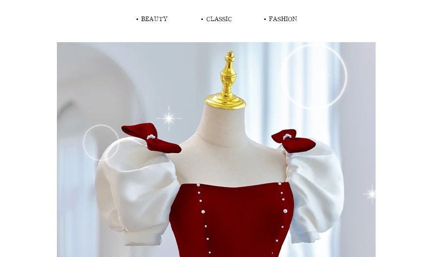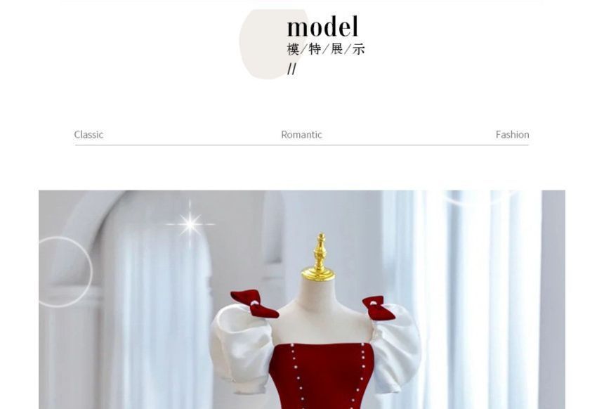 Puff-Sleeve Two Tone Bow A-Line Evening Gown