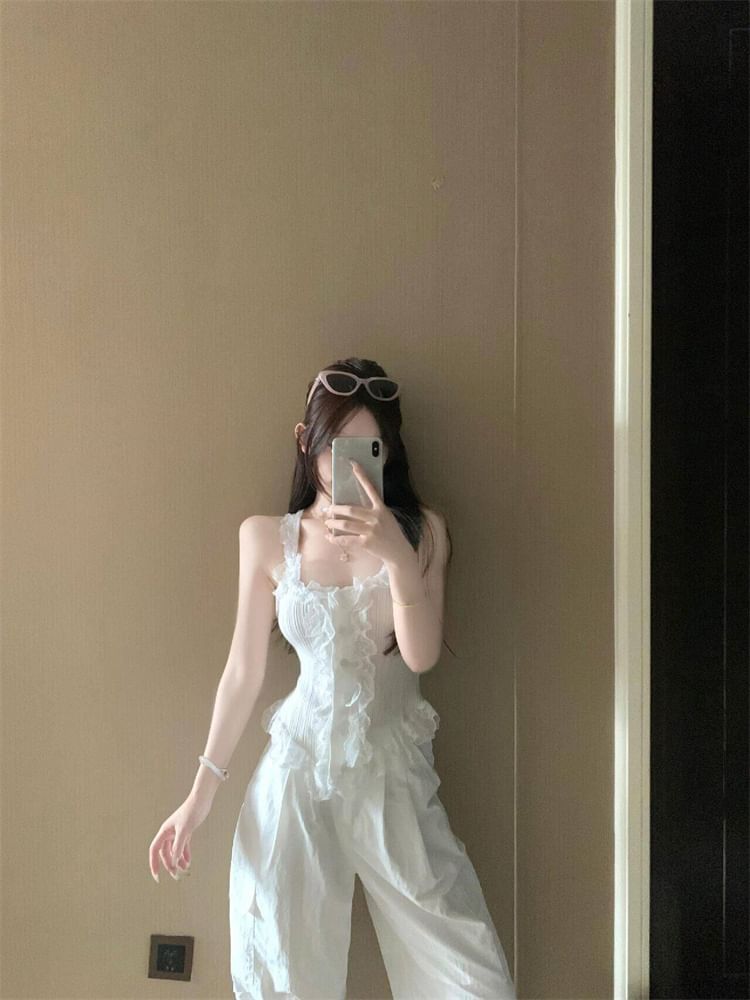 Scoop Neck Plain Asymmetrical Lace Trim Button