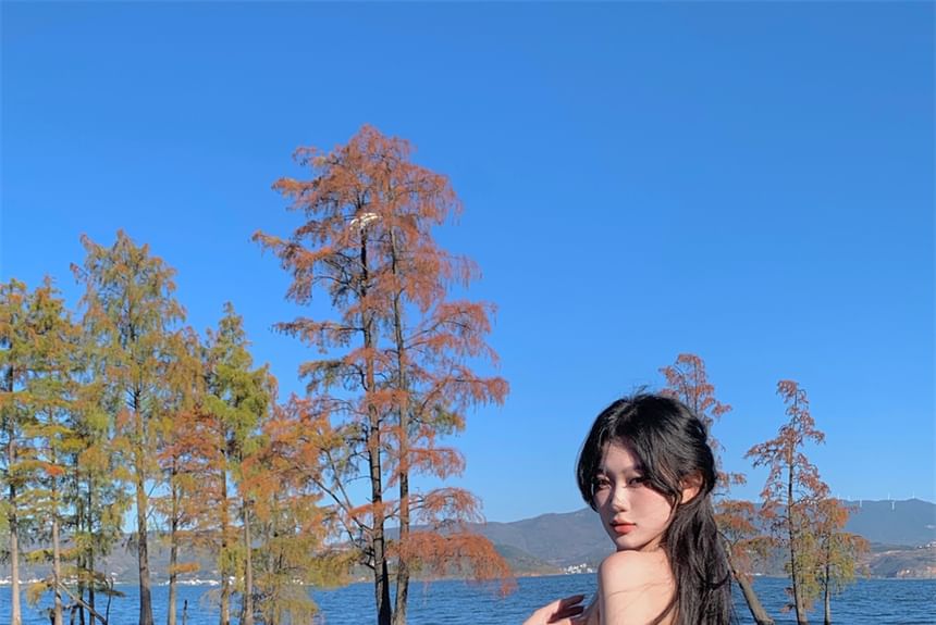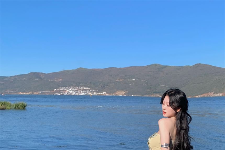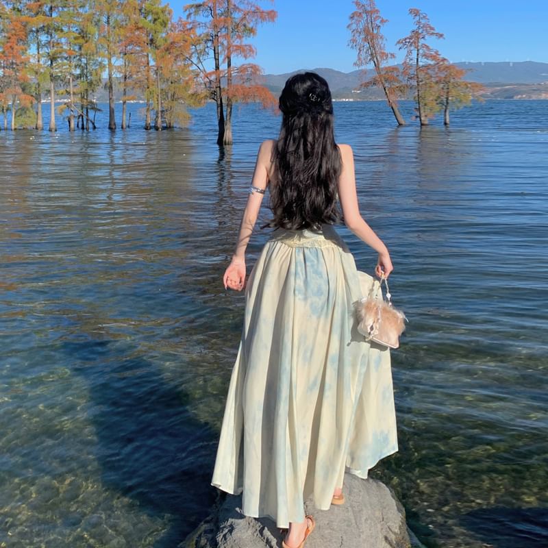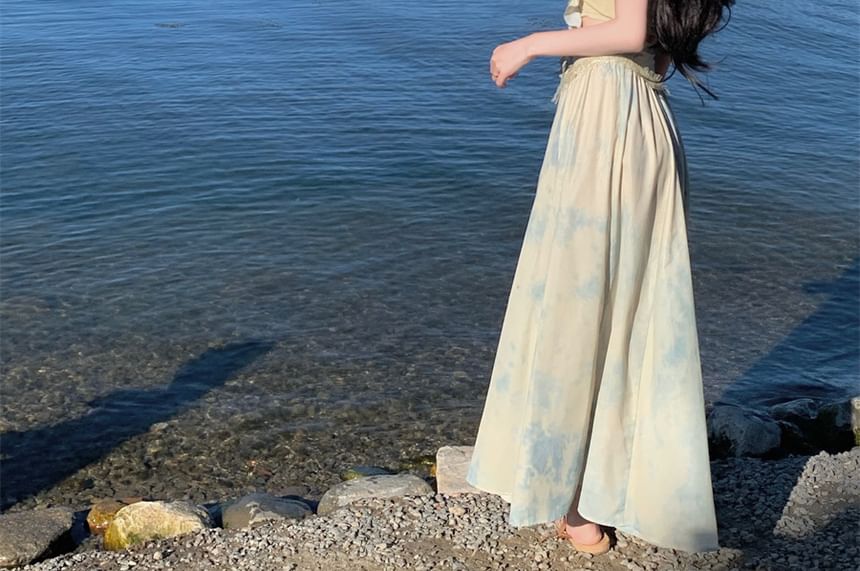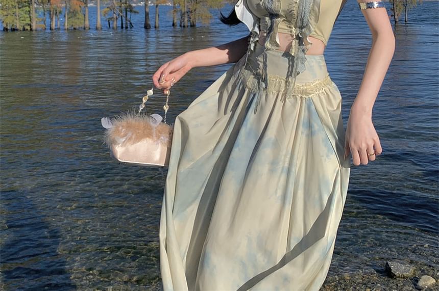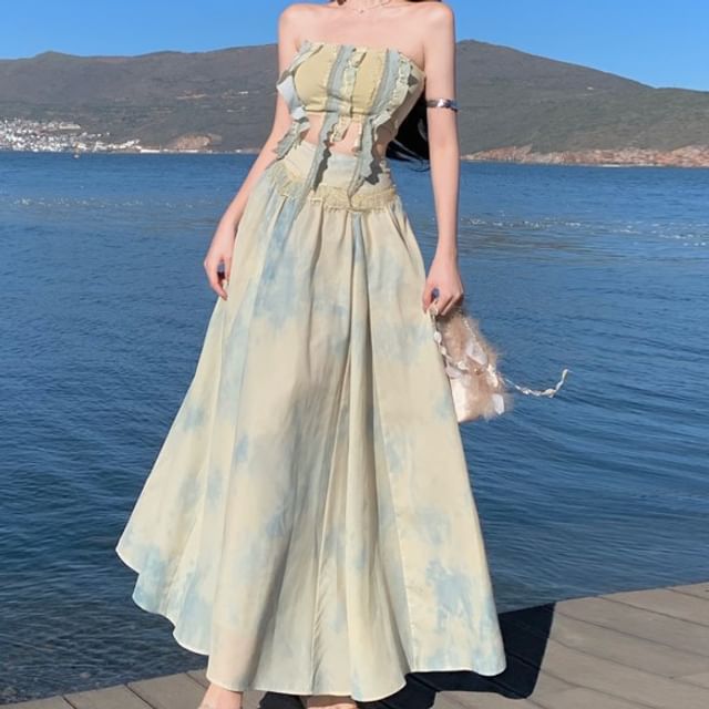 Set: Two Tone Asymmetrical Lace Trim Crop Tube Top + High Waist Tie Dye Maxi A