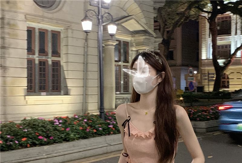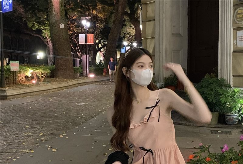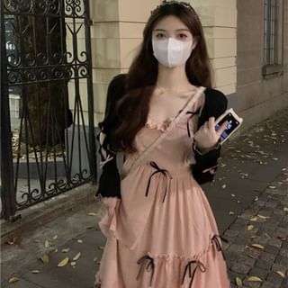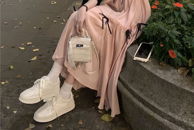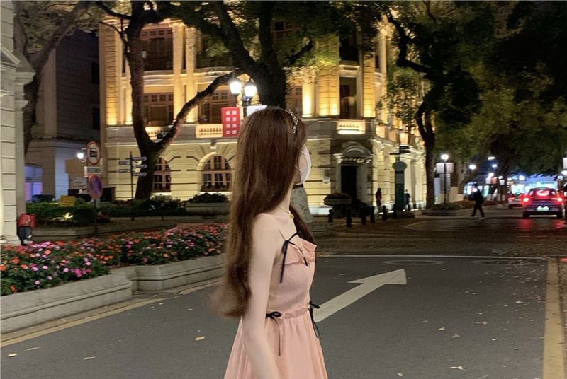 Spaghetti Strap Plain Bow Ruffled Midi A
