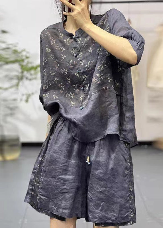 Women Navy Stand Collar Print Cotton 2 Piece Outfit Summer QK011