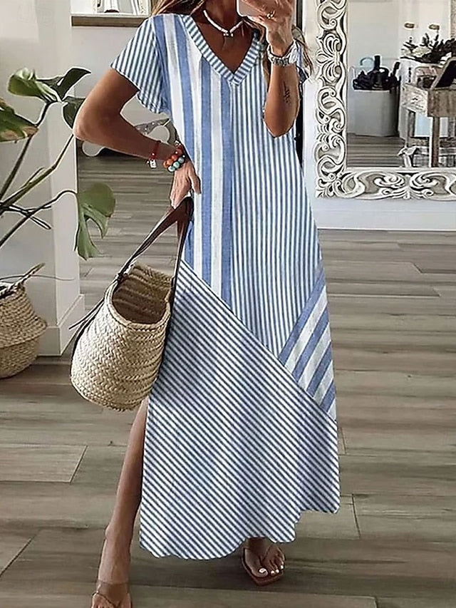 Dresses Type: Summer Dress, A Line Dress, Fabric: Polyester, Gender: Women's, Occasion: Daily, Design: Print, Style: Vacation, Casual, Fit Type: Regular Fit, Dress Length Type: Maxi Dress, Neckline: V Neck, Sleeve Length: Short Sleeve, Elasticity: Micro-elastic, Look After Me: Hand wash, Machine wash, Dry clean only, Pattern: Striped, Graphic, Season: Summer,