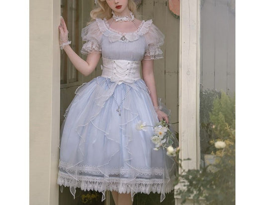 Lolita-Minikleid in A-Linie mit Puffärmeln, Kragen, schlichtem Cut-out, Rüschen und Schnürung / Kette / Reifrock / Set