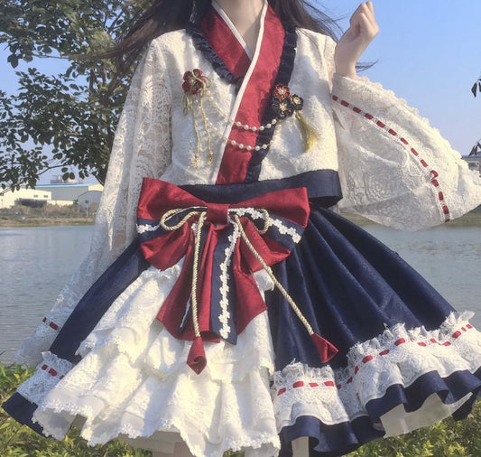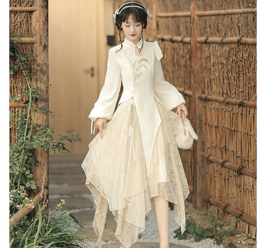 Lolita Langärmlige bestickte Hanfu-Bluse / Mittelhoher Midi-A-Linien-Spitzenrock / Set