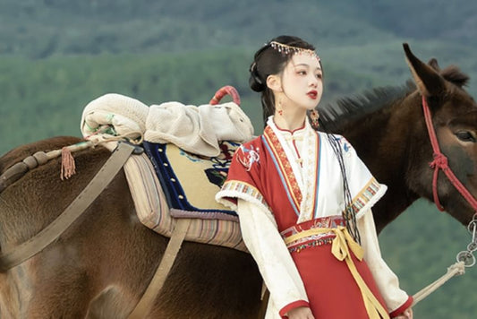 Lolita Langarmbluse mit Stehkragen und Kontrastbesatz sowie Froschverschluss / Kurzärmliges Hanfu-Oberteil mit Blumenstickerei und flauschigem Besatz / Maxirock in A-Linie mit hoher Taille und Falteneinsatz / Set