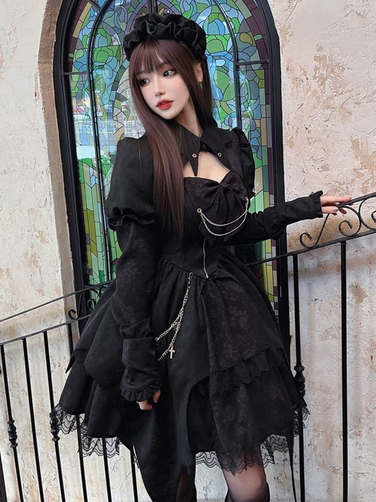 Lolita Langärmlige Bluse mit Schnürung / Minikleid in A-Linie mit Spaghettiträgern / Set