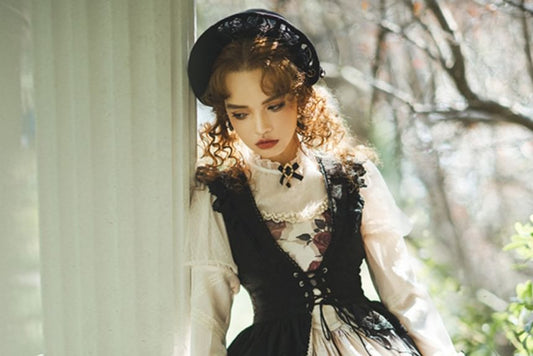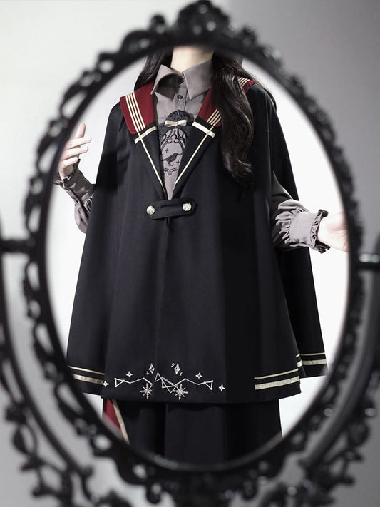 Lolita Langarmshirt mit Biesen, Kragen, Vogelstickerei / Umhang / Midirock in A-Linie mit hoher Taille / Set