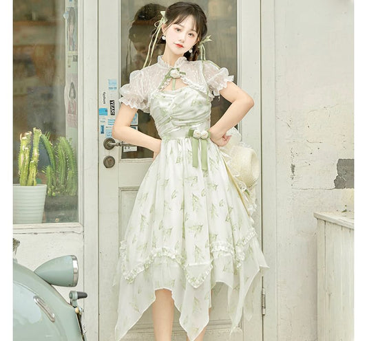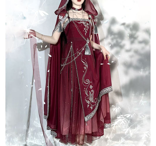 Lolita Spaghettiträger Besticktes Hanfu Midi A-Linien Kleid / Leichter Umhang / Set