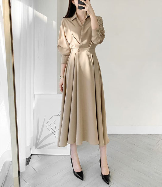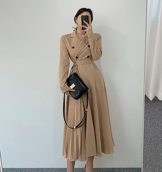 Long Sleeve Collared Plain Accordion Pleated Double Breasted Midi A-Line Dress