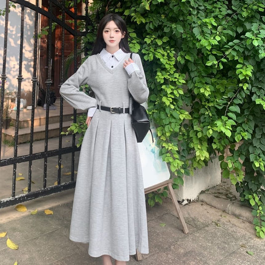 Long Sleeve Collared Striped Mock Two Piece Pleated Midi A-Line Dress