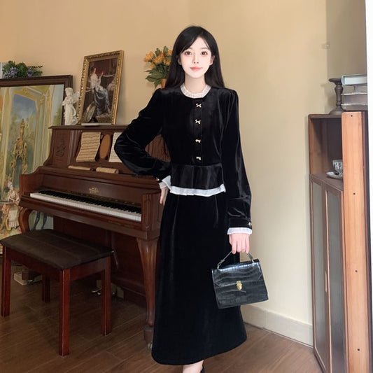 Long Sleeve Band Collar Ruffle Hem Velvet Midi A-Line Dress