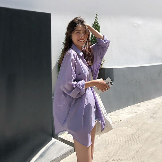 Long Sleeve Collared Plain Shirt / High Waist Maxi A-Line Skirt