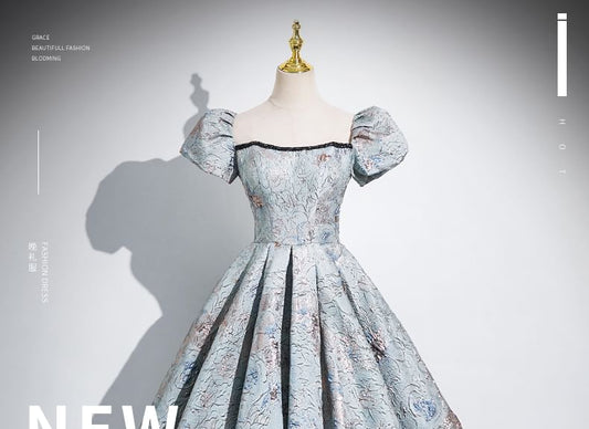 Puff Sleeve Square Neck Pleated Jacquard A-Line Evening Gown