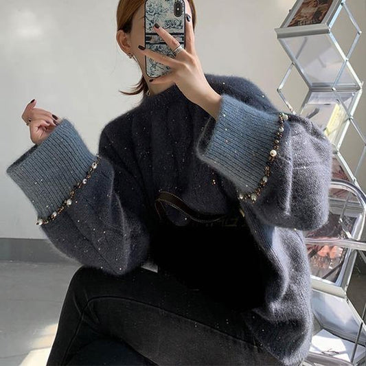 Chic Grey O-neck Sequins Long Sleeve with Beaded Knit Sweater TW022