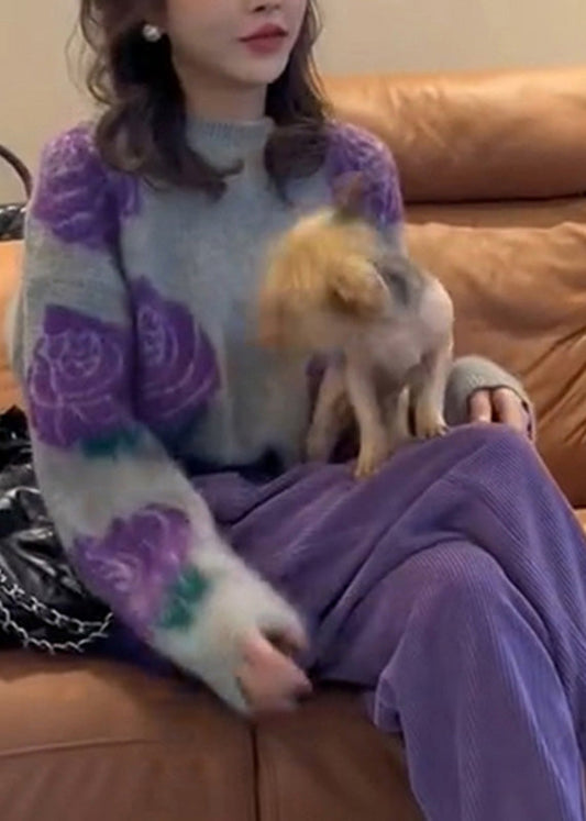 Fashion Purple Print Cotton Knit Sweater And Wide Leg Pants Two Pieces Set Winter RK013