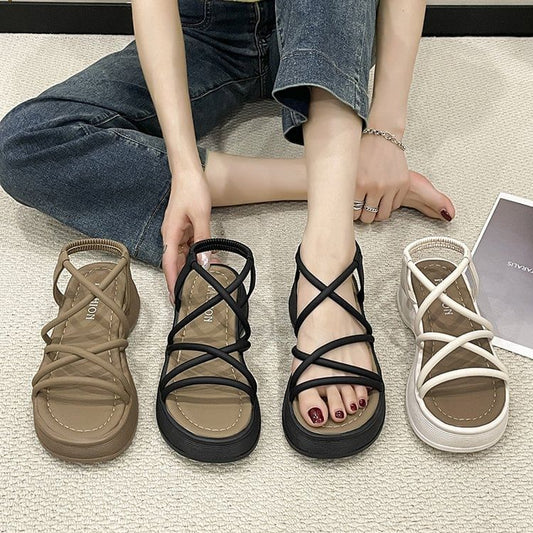 Platform Cross Strap Tweed Faux Pearl Accent Sandals