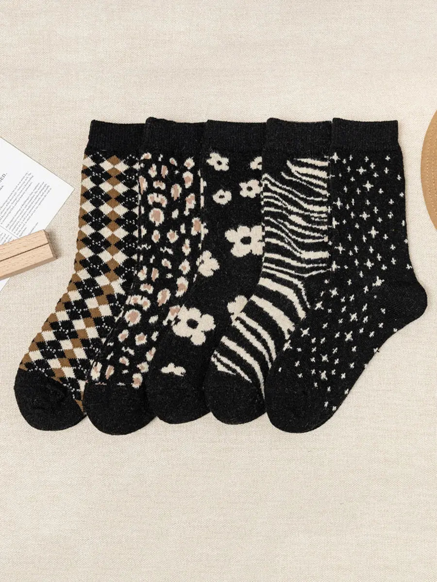 Verleihen Sie Ihrer Sockenkollektion mit diesen Jacquard-Wollsocken für Damen eine gemütliche und stilvolle Note. Diese Socken aus weicher und warmer Wolle verfügen über ein verspieltes Jacquardmuster, das jedem Outfit eine lustige Note verleiht. Halten Sie Ihre Füße mit diesen ausgefallenen Socken warm und modisch.