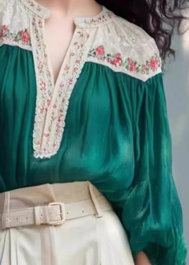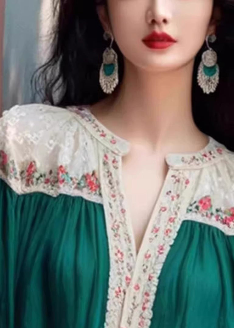 Art Green V Neck Patchwork Cotton Shirt Bracelet Sleeve RK027