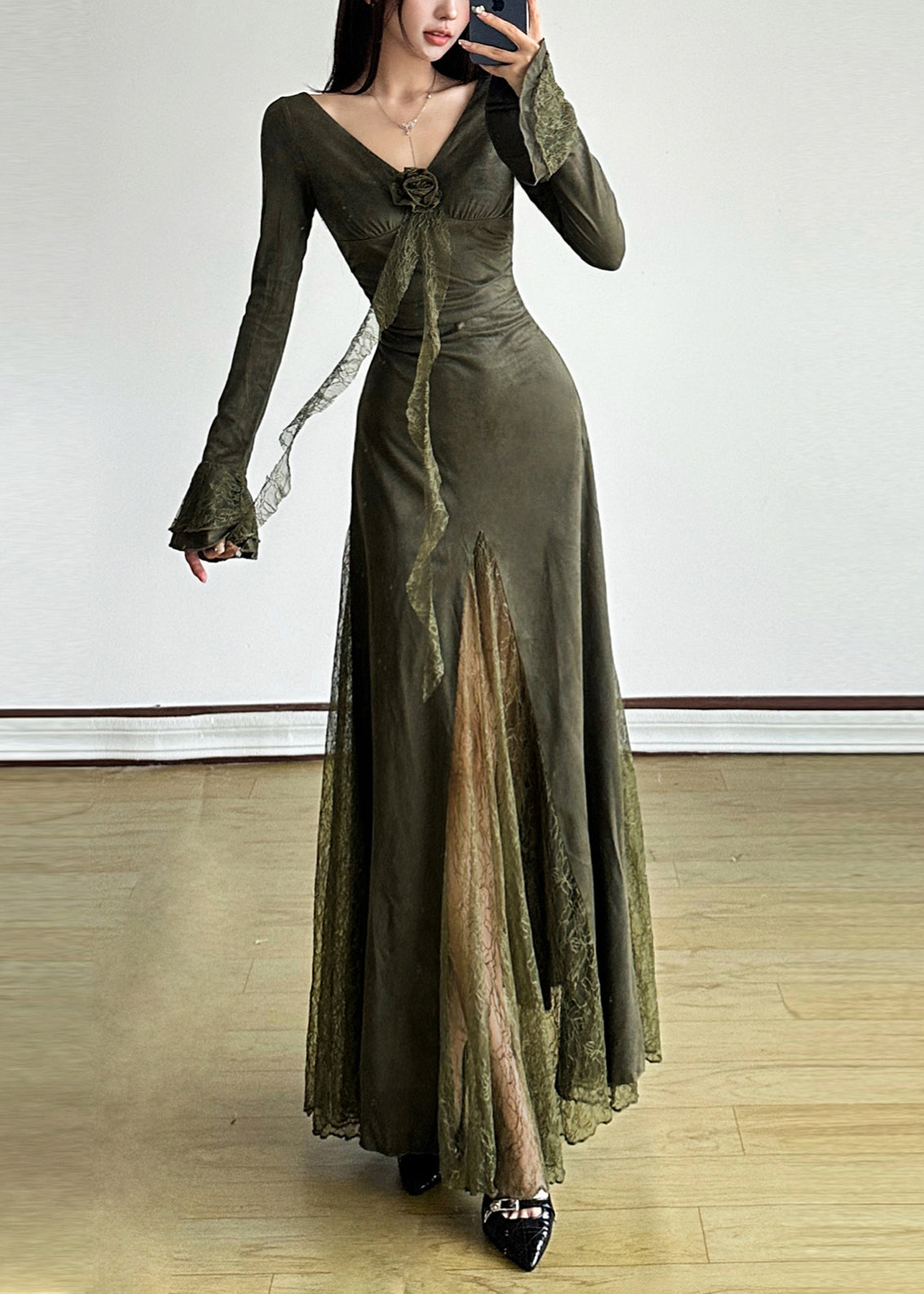 Elegant Blackish Green Patchwork Lace Long Dress Flare Sleeve YP047