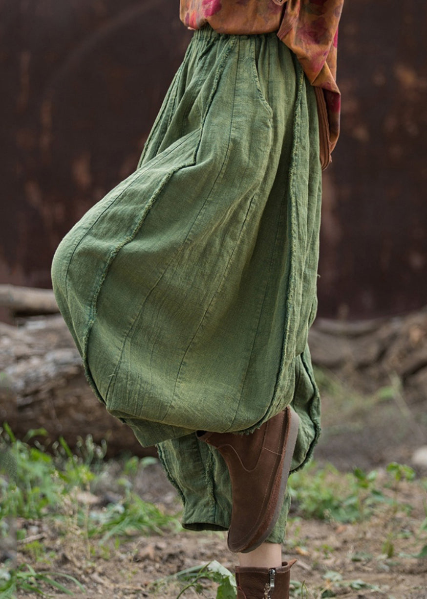 Green Solid Linen Wide Leg Pants Elastic Waist QE027