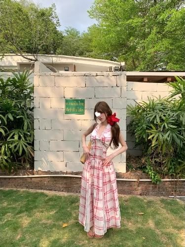 Halter Plaid Open Back Lace Panel Midi A-Line Dress