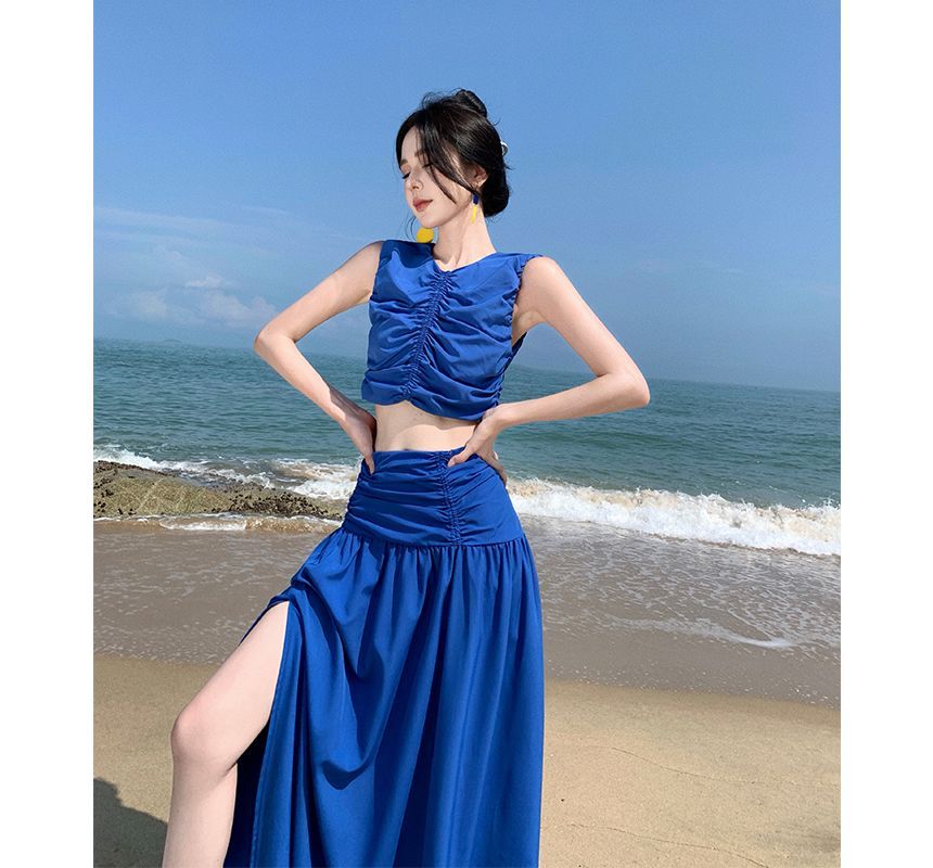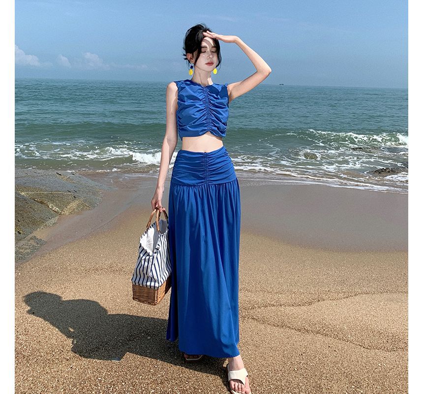 Set: Crew Neck Plain Ruched Crop Tank Top + High Rise Slit Maxi A