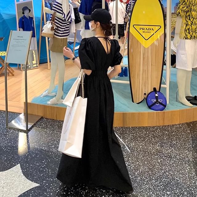 Short-Sleeve Square Neck Plain Maxi A-Line Dress