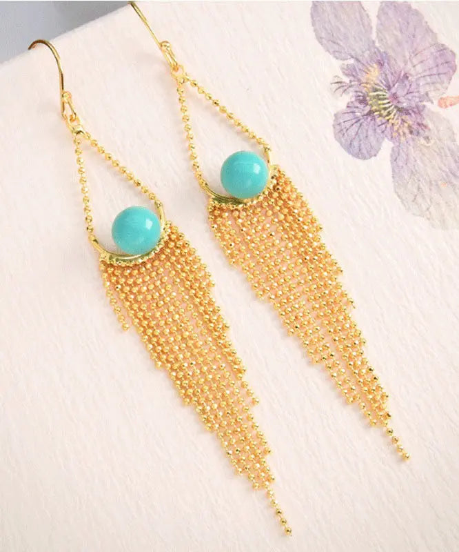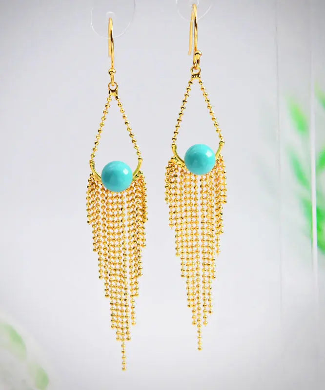Verleihen Sie Ihrer Garderobe mit diesen ausgefallenen vergoldeten Quasten-Ohrringen aus Sterlingsilber mit Türkis einen Hauch von Verspieltheit. Das charmante Quastendesign und die atemberaubenden türkisfarbenen Steine sind ein echter Hingucker und machen Sie zum Stadtgespräch. Perfekt, um jedem Outfit eine verspielte, einzigartige Note zu verleihen. (Begrenzte Stückzahl verfügbar!)