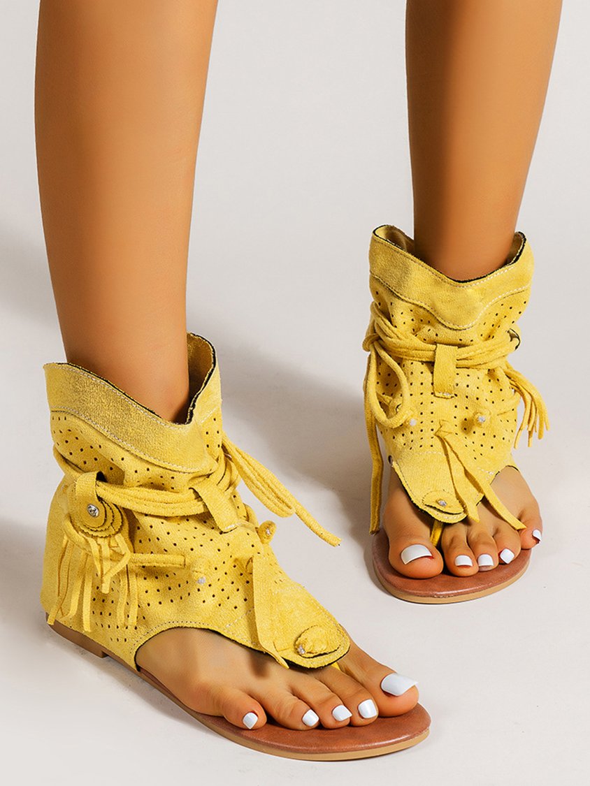 | Produkttitel: | Flache Retro-Zehentrenner-Sandalen mit Quasten und Cut-outs QAS60 |