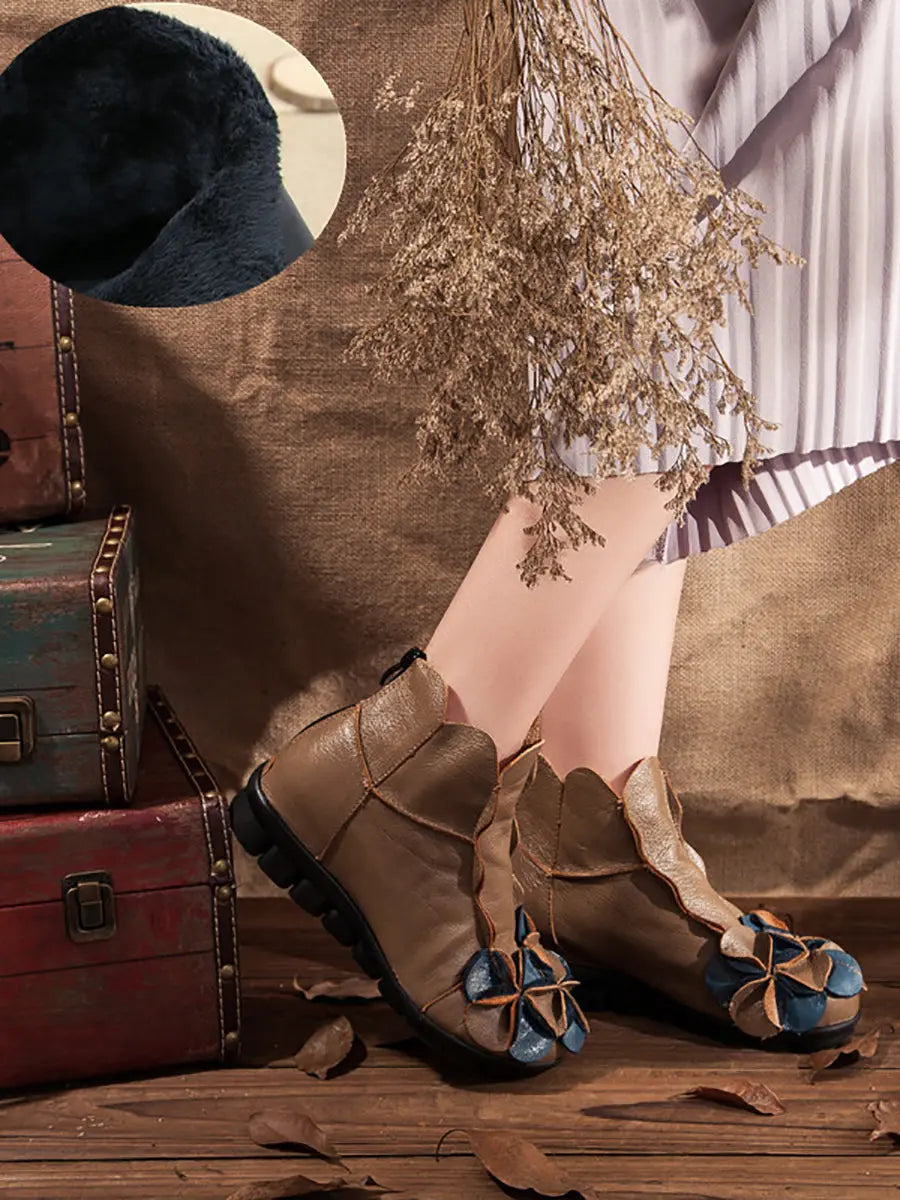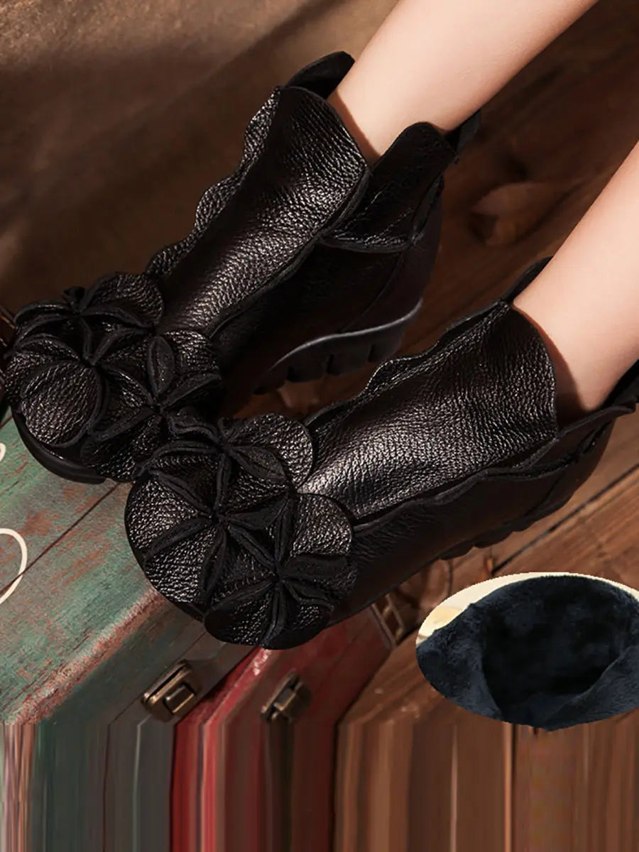 Mit diesen ausgefallenen Lederstiefeletten mit ausgefallener Blumenverzierung sind Sie stilvoll unterwegs. Diese Stiefel verleihen jedem Outfit eine verspielte Note.