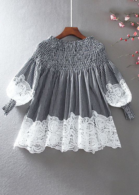 French White O-Neck Wrinkled Patchwork Hollow Out Shirt Long Sleeve NN036