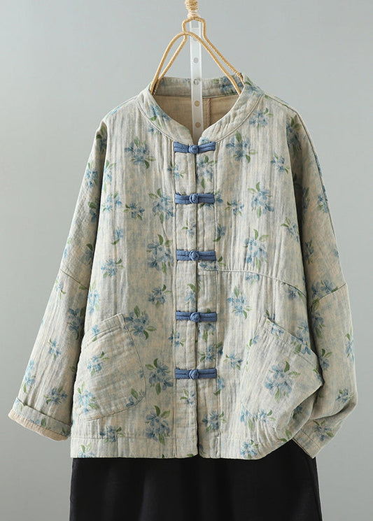 Blue Print Button Cotton Filled Winter Coat O Neck QG032