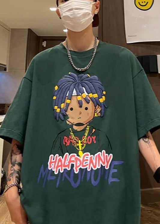 Green Neck Print Summer Shirt Mens Cotton T Vintage O