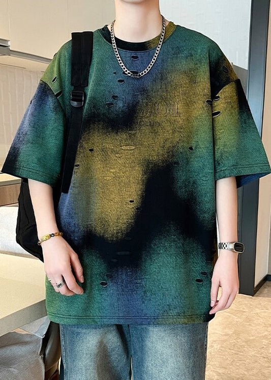 Men Dye Unique T Tie Summer Shirt Green Hole Cotton