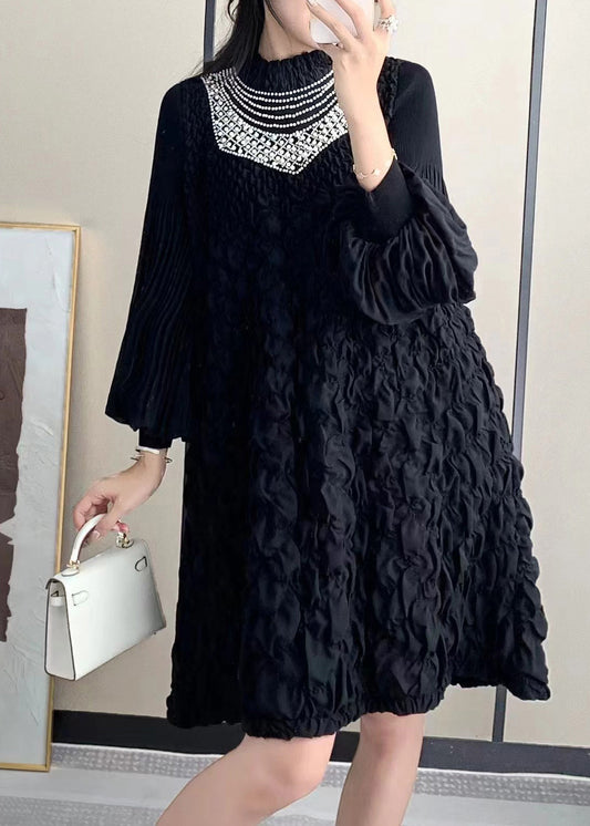 French Beige Stand Collar Wrinkled Nail Bead Mid Dress Lantern Sleeve TA002