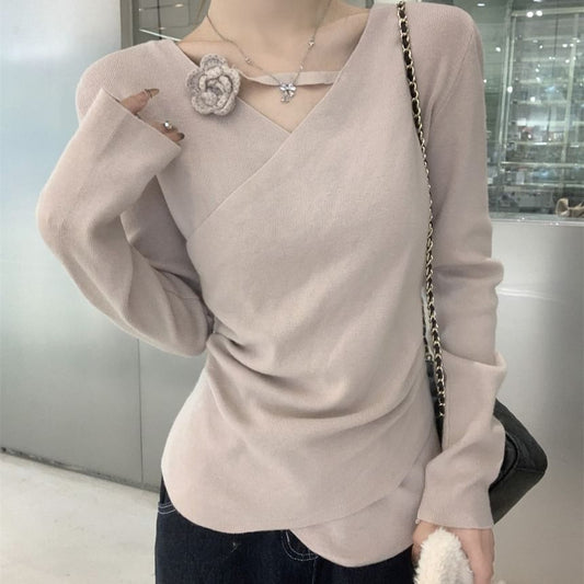 Long-Sleeve V-Neck Plain Asymmetrical Floral Accent Slim Fit Knit Top
