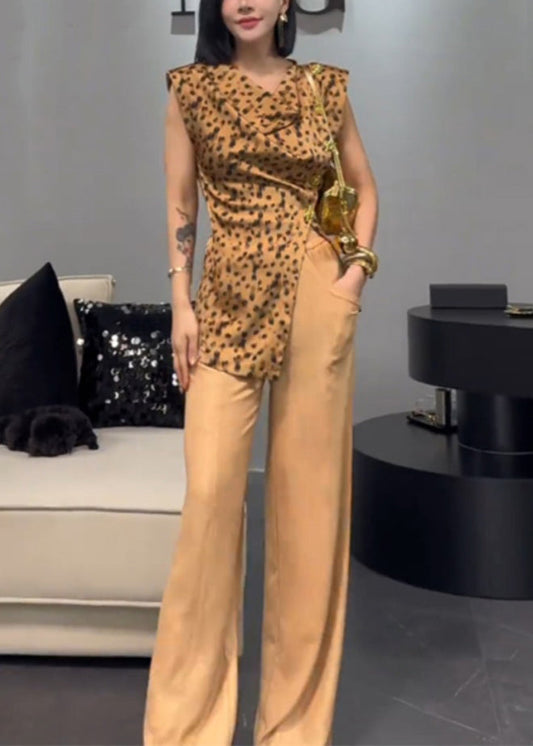 French Yellow Asymmetrical Print Pockets Cotton Two Pieces Set Sleeveless