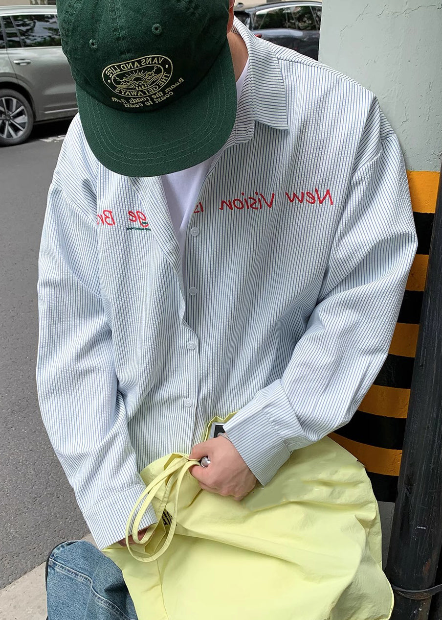 Striped Blue Peter Pan Collar Letter Cotton Men Shirts Spring