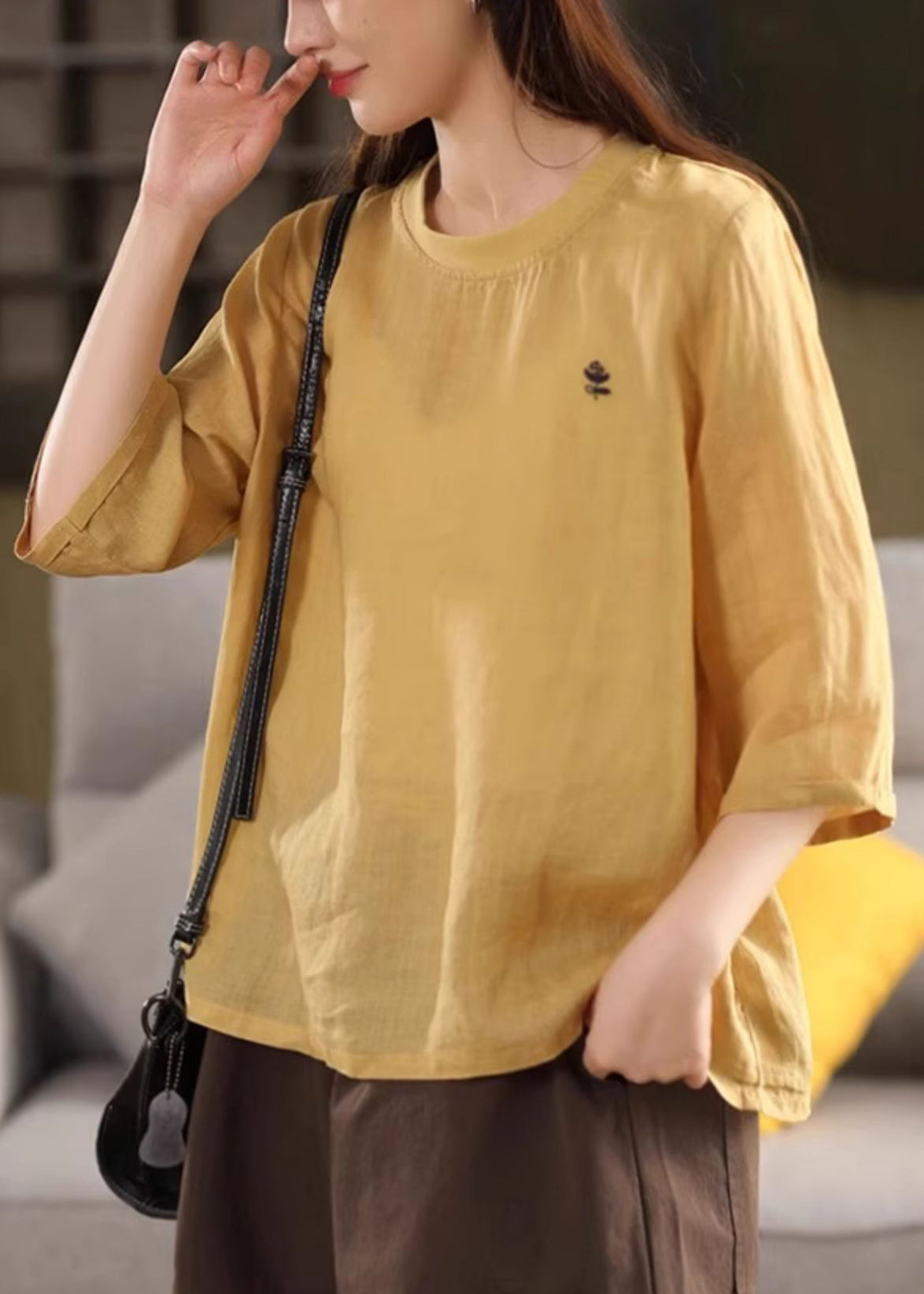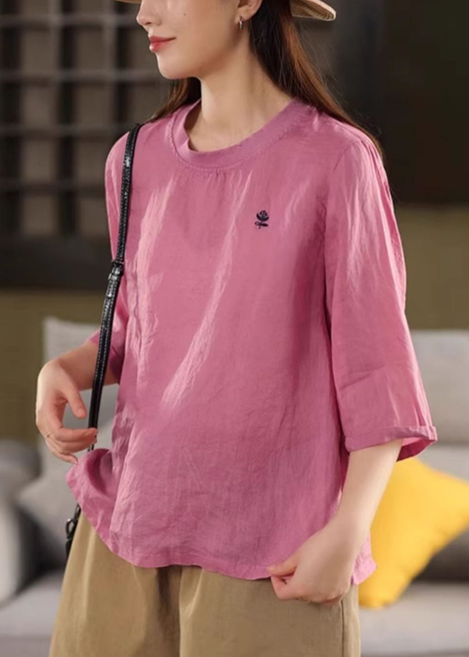 Half Neck Cozy Shirt Print O Linen Green Sleeve T